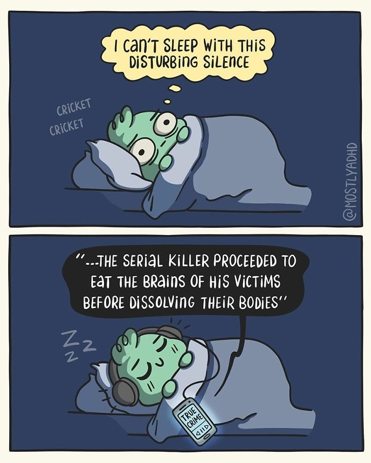 So if one finds comfort in falling asleep over serial murder podcasts or other topics, then so be it! Maybe the brain finds comfort in listening to such areas after all.