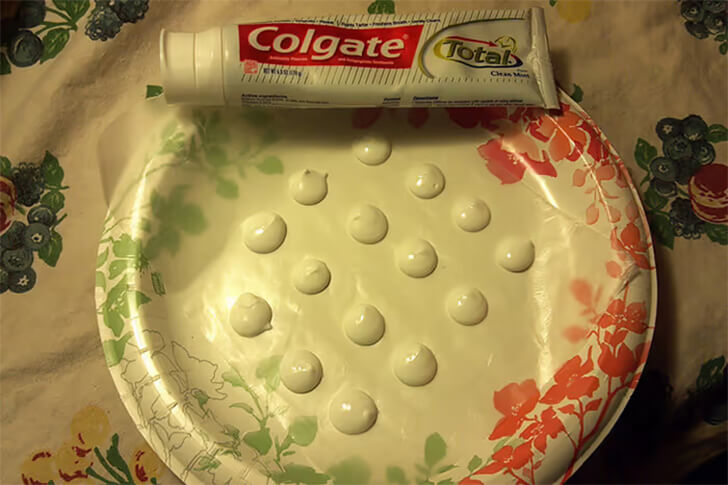 Camping’s no excuse for neglecting oral hygiene, and the toothpaste dot trick has your back. Look at those small toothpaste dollops on a plate sprinkled with baking soda. Those dry up and harden, turning into portable toothpaste dots.