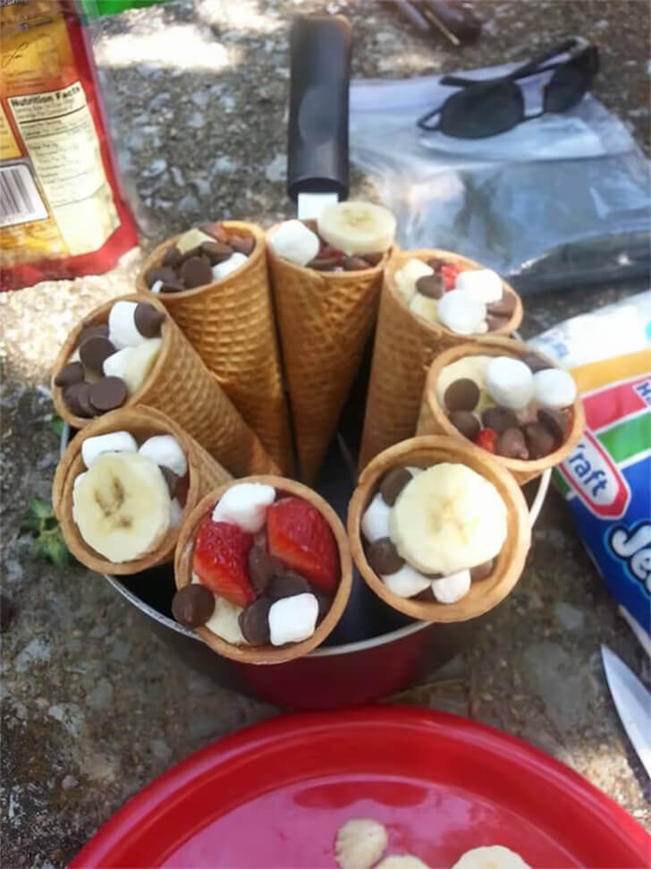 S’mores are so last season—let’s talk about the waffle cone delight! Get an ice cream or waffle cone, and go wild. Fill it with layers of fluffy mini marshmallows, fruits like bananas and strawberries, yummy chocolate chips, and more. Wrap it all up in foil like a treasure, and grill it over the campfire for a few minutes.