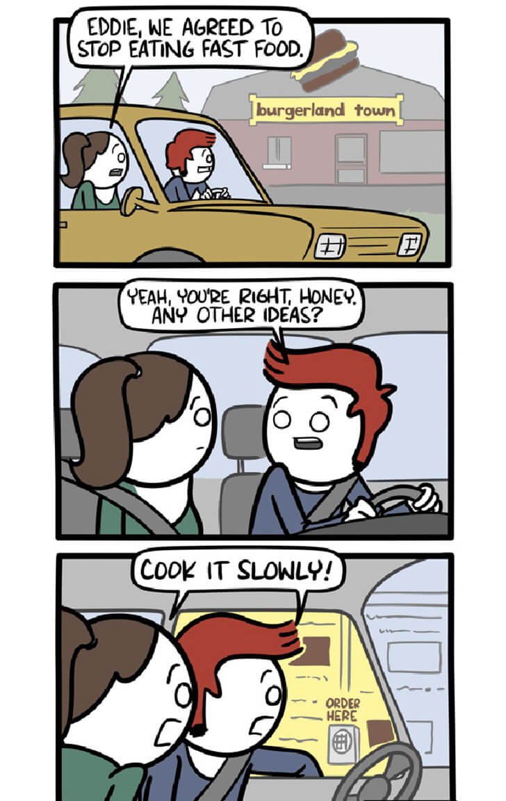 The couple in the comic knows eating fast food is bad for them, but they’re not strong enough to hold each other responsible. According to Healthline, fast food is highly addictive because it releases dopamine into the brain, which triggers our reward system.