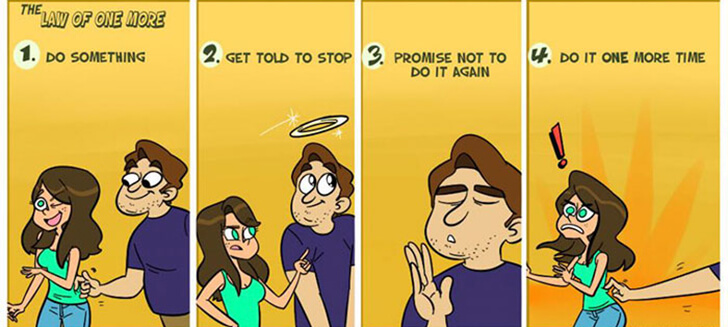 The following comic is titled “The Law of One More” and is about trying everything a second time. While we do understand the humor in the comic strip (and can relate to it), it’s important to know how to distinguish between a playful “Stop” and an actual “Stop.”