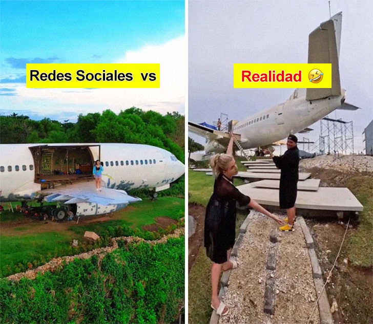 En cambio, los de la segunda imagen, también, parecen haber llegado al avión abandonado solo que no se esmeraron en hacer que la foto no tenga la escenografía detrás, por lo que se puede observar todo el ensamblado para que los turistas accedan.