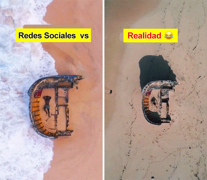 En ambas fotos la persona se ve muy relajada, y ambas fotos podrían ser tranquilamente reales. Solo que una tuvo la suerte de ser captada cuando la marea alta rodeaba y golpeaba en la estructura que protegía al muchacho.