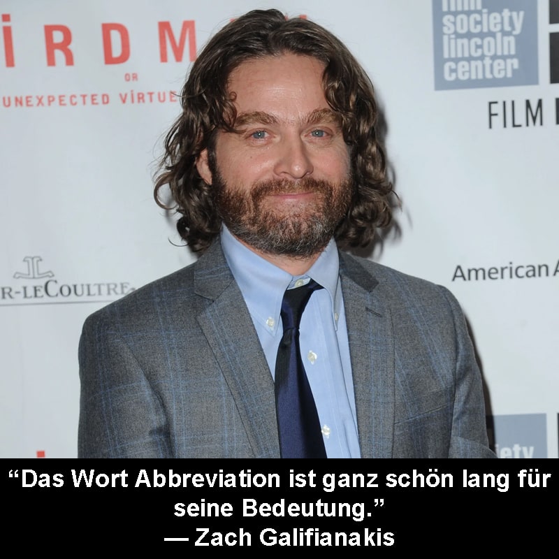 Abbreviation bedeutet Abkürzung und Zach hat recht, für seine eigentliche Bedeutung ist das Wort ganz schön sperrig. Zum Glück steht es uns frei, das Wort zu vermeiden. Wir setzen bei der Wortwahl lieber auf Wörter, die leicht und schnell von der Zunge gehen, so wie der Schauspieler.