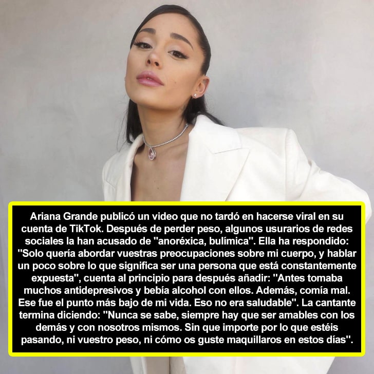 La cantante debió responder a las constantes críticas sobre su peso y a las acusaciones de ser bulímica. Ariana comentó en sus redes que no era agradable recibir esos comentarios y que nadie sabe por lo que estaba pasando el otro y que lo mejor era ser amables entre sí.