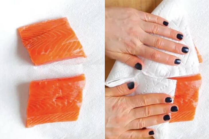 Drying meat or any protein, like chicken or fish, before searing eliminates moisture present in their exterior. This avoids more moisture release while cooking or the possibility of sticking in the pan when placed.