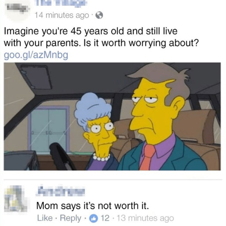 Self-deprecating humor is a tool of the clever. And it’s more relevant than ever in this era of endless online trolls. One individual, in particular, stood out from the crowd with their brilliant self-jab. In response to an article slamming older people still with their parents, they quipped, “My mom says it’s not worth moving out.”