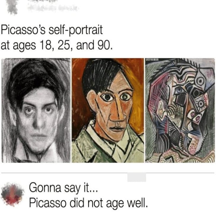 A social media user shared a fascinating comparison of Picasso’s self-portraits over the years, which prompted an amusing response. The commenter humorously suggested that perhaps Picasso’s last self-portrait was an accurate depiction of the painter at age 90. Weird as it might seem, it is still funny.