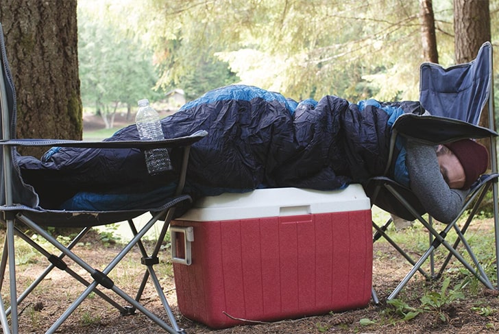 In a campsite transformed into a realm of whimsical slumber, an outdoor enthusiast engineers an inventive sleepscape. With head and feet cradled by camping chairs, they’ve found comfort in asymmetry. A trusty big red cooler, an unexpected mattress, supports their dream-filled repose.
