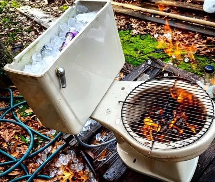 Who needs ordinary when you can have a toilet that chills drinks on ice and grills up a barbecue feast? Yes, you read that right! With cans nestled amid ice cubes and a fire-ready grill where you’d least expect it, this throne takes camping convenience to a whole new level.