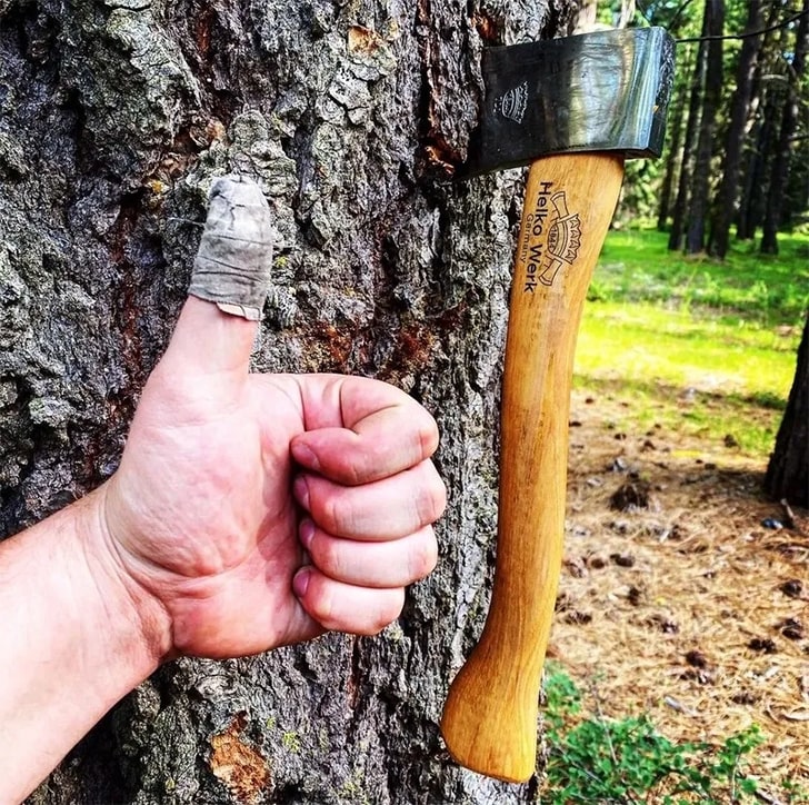 Nature’s playground is open, but heed this warning: not all escapades are camper-friendly. This brave soul thought he’d tame a hatchet. Hatchets and novices don’t mix! He learned firsthand that hatchets wield power beyond timber taming. It’s a lesson etched in “What Not to Do” history.