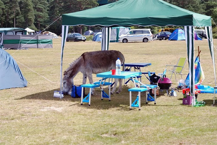 Camping rule #1: Your food is never safe in the great outdoors. Enter the wildlife gastronomes who’ve got noses sharper than bloodhounds. From bears to raccoons, no cooler box is safe from their culinary curiosity. A daring donkey—the sneakiest snack thief on the block.