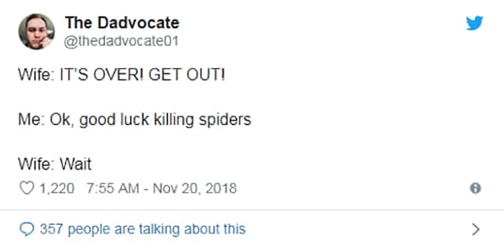 Ah, thedadadvocate01 found the ultimate trump card: spiders! His wife might be fed up with him, but the thought of a house full of eight-legged roommates has her pressing the pause button. Funnily enough, this brings to light how household roles naturally evolve in relationships, often divided according to who is less squeamish about, say, spider removal.