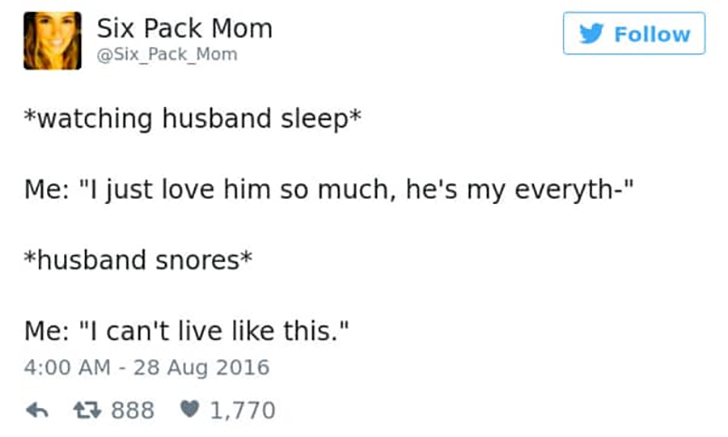 Six_Pack_Mom hits the nail on the head with the age-old “I love you, but…” conundrum many couples can relate to. One moment, she’s adoringly watching her husband, lost in the depths of her love. The next? That rhythmic snore shatters the romantic reverie.