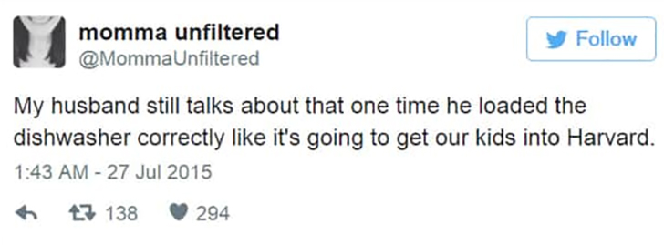 Oh, the domestic victories that become legends! Twitter user MommaUnfiltered paints the perfect picture of her husband still riding high on that one time he nailed dishwasher Tetris. Like he’s expecting a scout from Harvard to knock on their door and say, “Your dad can load a dishwasher? Full scholarship for the kids!”
